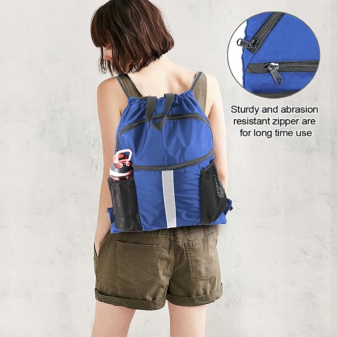 - MULTI-FUNCTIONAL POCKETS: The big shoe compartment in front of gym drawstring bag can hold two pairs of shoes; the smaller zipper front pocket is perfect for keeping an ipad, towel, and other items, besides, two sides mesh bags allow you to place a water bottle, umbrella easily. Inside of draw string bag, the zipper pocket can hold small valuables such as wallet, cellphone, keys and so on. Multiple Pockets help you to keep things to be placed by category, easy to be found.