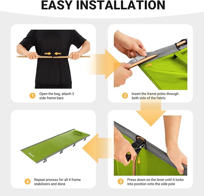 - ✔EASY to SET UP and LIGHTWEIGHT PORTABLE DESIGN: No assembly required. The sleeping cot for adults can be easily installed or folded up into an included storage bag within 10 seconds. Pack size 14"×5.1"×5.1". Weight 4.4 pounds.