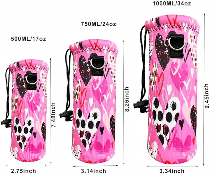 • Three Size for your choice: 500ML(16.9oz) water bottle bag,Length-7.48 inches,Diameter-2.75 inches;750ML(24oz) water bottle holder,Length-8.26 inches,Diameter-3.14 inches;1000ML(34oz) water bottle carrier,Length-9.45 inches,Diameter-3.34 inches.
