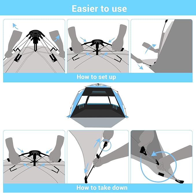 - 【Fully automatic Pop Up Beach Tent】All you need to do is lift the top pole with the force of a bottle of water, and the fully automatic stand system does the rest. New tent pole construction with bucket ty-wrap and patent carry bag help you spend less time folding back. The Pop Up Sun Shelter utilizes the traction automatic lift technology to enhance the elastic compression retractable, one person can easily open it in one second, close it in two seconds, and tidy it up in three minutes