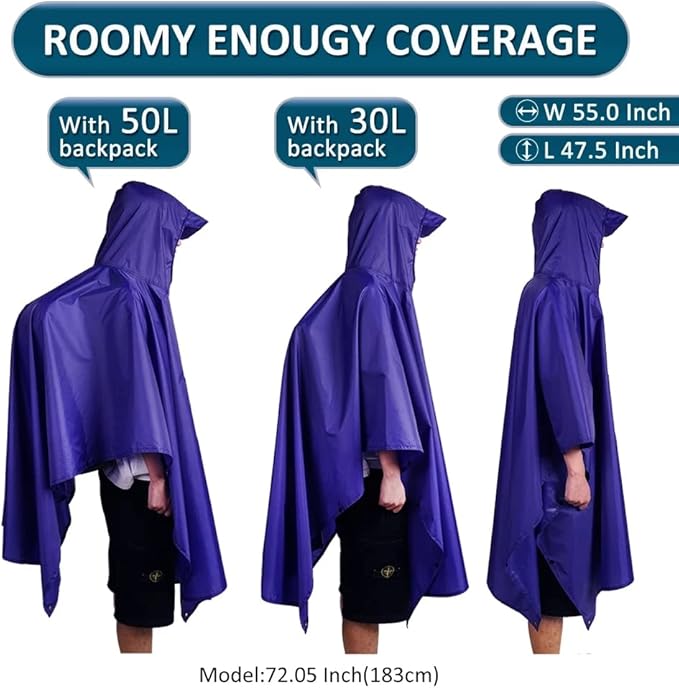- 【Multifunctional】 Our Multifunctional Rainwear can not only be used as a raincoat, but also as a tent, moisture-proof pad, cloak, poncho and jacket. It can also be built into a small canopy to protect against rain and water, avoid direct sunlight and easily deal with all kinds of rainy weather conditions.