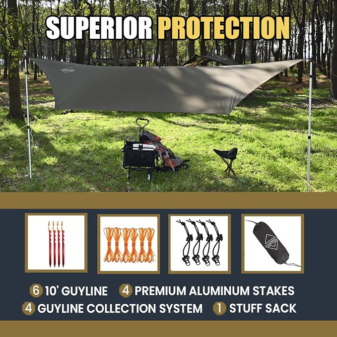 - EASY SET UP. This tarp is easy to set up and comes with everything you need for an ultimate camping experience. It includes suspension kit including 10'*6 guyline, 4 aluminium tent stakes, 4 guyline collection system, and one double-ended stuff sack that holds everything including the tarp for easy storage and mobility.