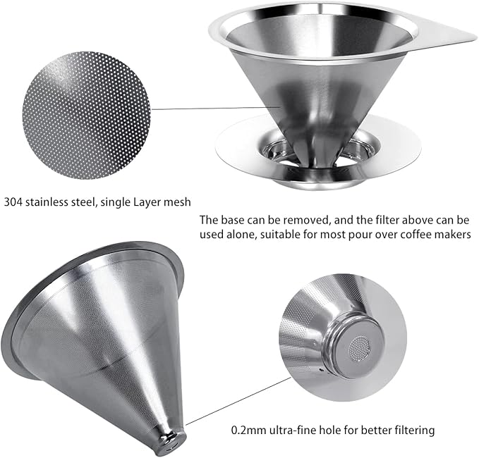 - 【WIDE CUP STAND】Wide metal base fits on most mugs, pots, and glass carafes. The bottom base is removable and the top cone filter can be used on the pour over coffee maker alone.