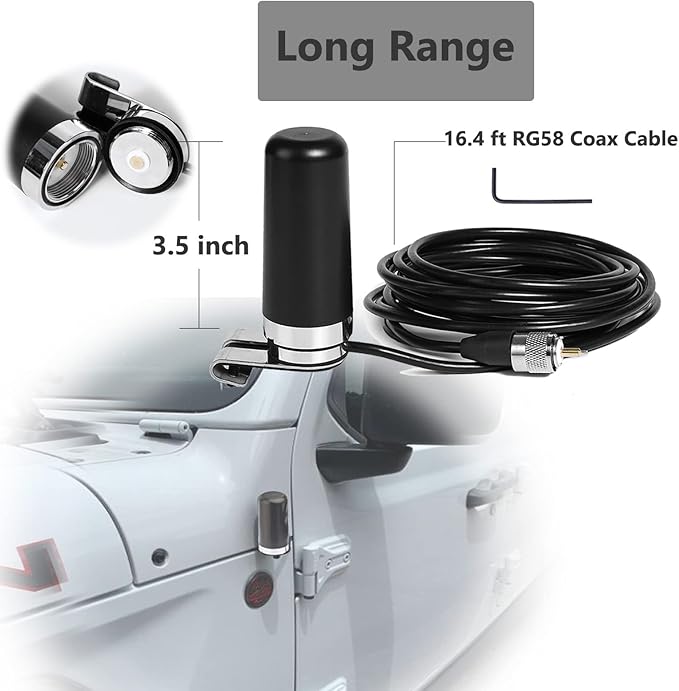 - 2.|Long Range|With External Bracket Lip Mount NMO Antenna: 3.5'' Antenna with NMO Base Mounting (100w) and 16.4 ft PL259 UHF Male cable. It built in clamp that attaches to the trunk or the hood of car.