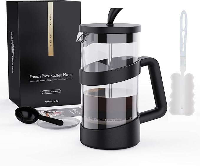 - Large FRENCH PRESS 34 OZ: RAINBEAN French press brews a pure and strong flavor cup of coffee in just 3 minutes, simply add course ground coffee, hot water and press,ensures you would be brewing like a barista on day one!When breakfast is over, just rinse out the grounds and toss your disassembled French Press into the dishwasher for easy clean up.