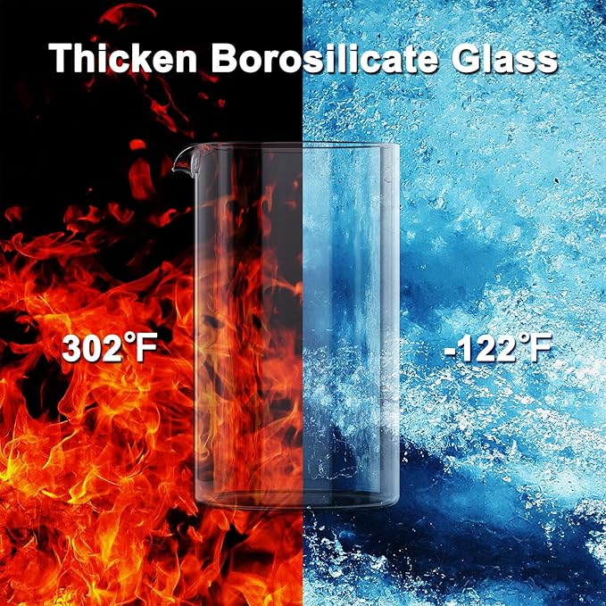 - STYLISH AND DURABLE DESIGN: Coffee carafe made of durable, heat-resistant German borosilicate glass and has good heat insulation effect ; The ergonomic handle is comfortable to grip,the base and handle are made of BPA-free polypropylene and you don't touch hot glass !
