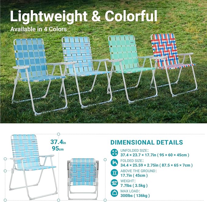- Durable and lightweight: The WEJOY aluminum beach chair is made of rust-resistant aluminum frame, ensuring long-lasting use and easy portability.