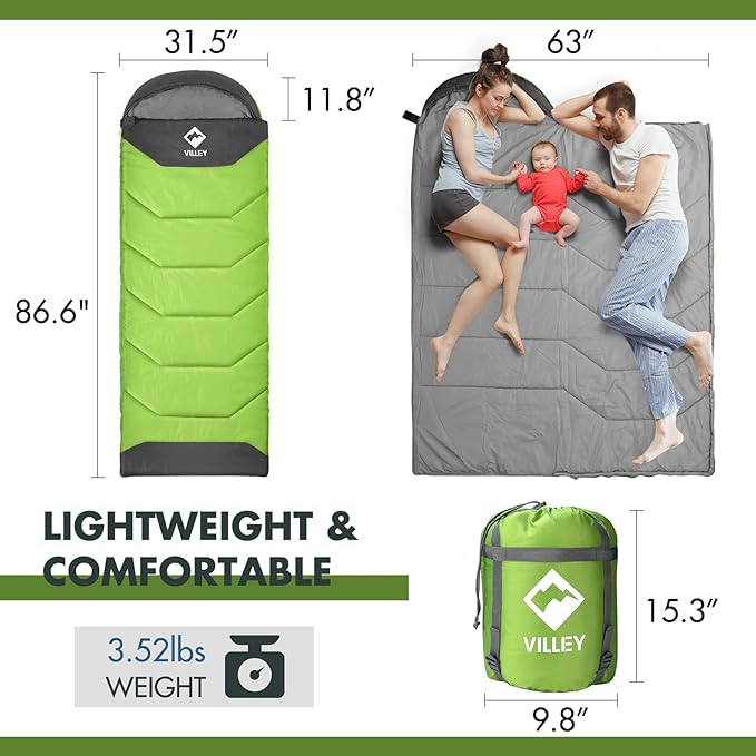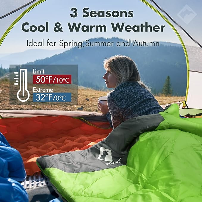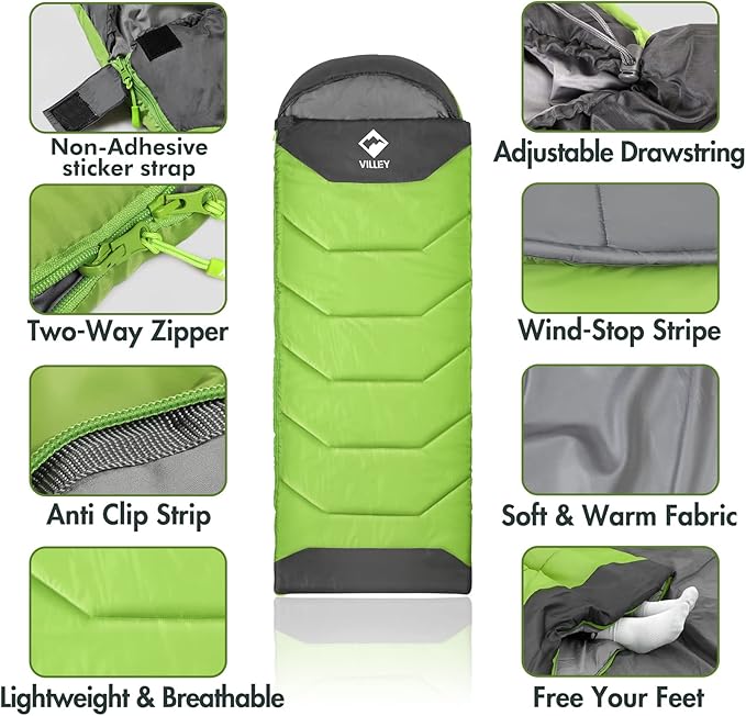 - USE FOR 3 SEASONS: The VILLEY sleeping bag with a soft liner is perfect for spring, summer, and autumn. With a temperature range of 32°F-50°F, you can enjoy a comfortable sleep. The semi-circular hood is designed with an adjustable drawstring to easily keep your head warm in colder climates