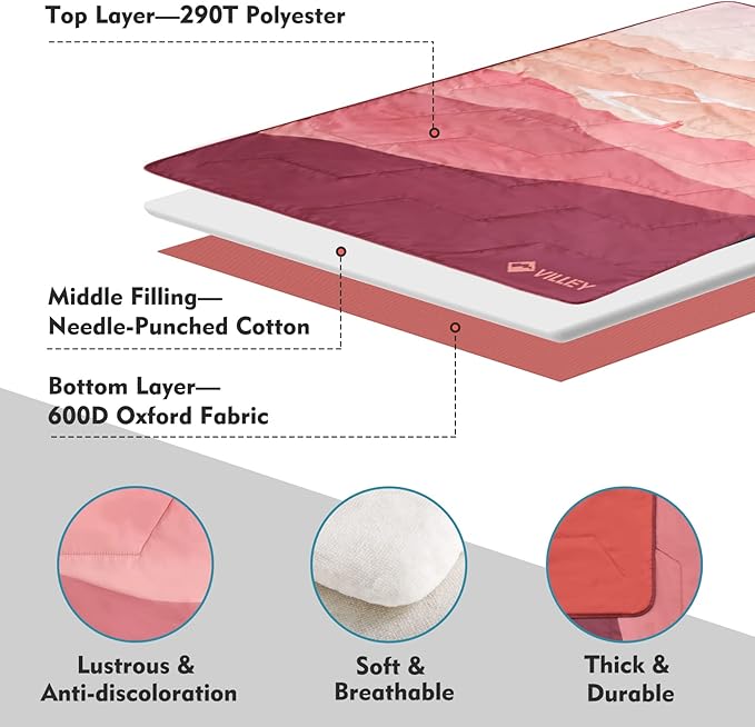 - Suitable for Beach: The blanket is waterproof and sandproof as a beach mat. Beyond breathability, the top layer and the bottom are brightly colored but won't fade, so you needn't worry about discoloration when wet.