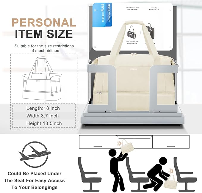 - Separate Shoe Compartment with Vents:This personal item bag has a separate compartment on the bottom for your shoes and dirty clothes. And the shoe compartment has 2 vents to disperse the bad smell of shoes