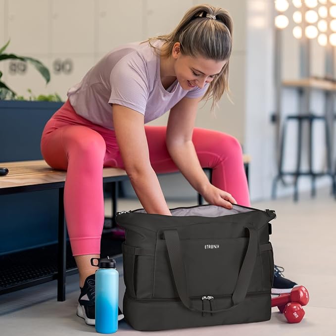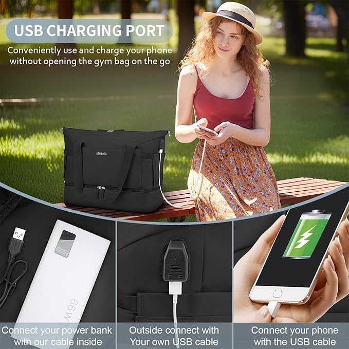 ETRONIK Gym Bag for Women, Personal Item Travel Bag with Shoes Compartment, Weekender Overnight Duffel Bag with Wet Pocket & USB Charging Port, Carry On Bag for Women, Travel, Gym, Weekend (Black)