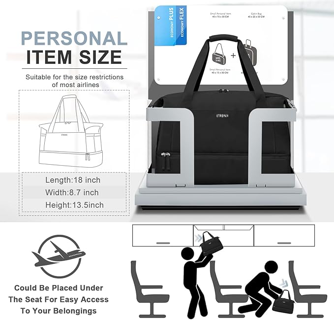 - Separate Shoe Compartment with Vents:This personal item bag has a separate compartment on the bottom for your shoes and dirty clothes. And the shoe compartment has 2 vents to disperse the bad smell of shoes