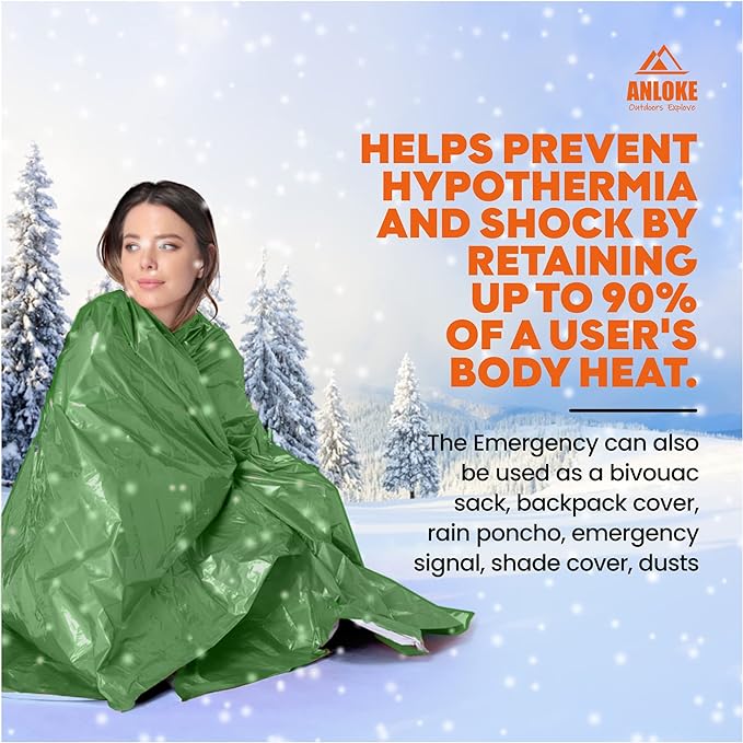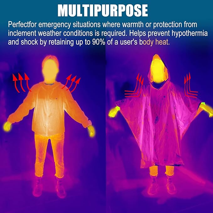 - ★MULTIPURPOSE★-- Perfect for emergency situations where warmth or protection from inclement weather conditions is required. Helps prevent hypothermia and shock by retaining up to 90% of a user's body heat. The Emergency can also be used as a bivouac sack, backpack cover, rain poncho, emergency signal, shade cover, dust shield, arm sling, sleeping bag liner, wind blocker, water collector, trail marker······