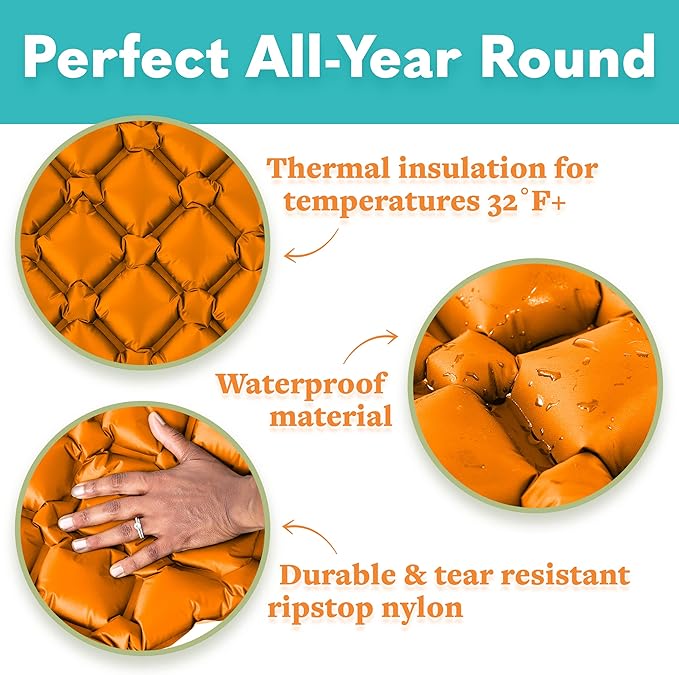 - TEAR RESISTANT WITH HEAVY DUTY RIPSTOP NYLON FABRIC – this lightweight sleeping pad is made of super strong, waterproof, camping-grade ripstop nylon fabric. With 20 denier thickness, this sleeping pad is designed to last a lifetime in the most severe conditions.