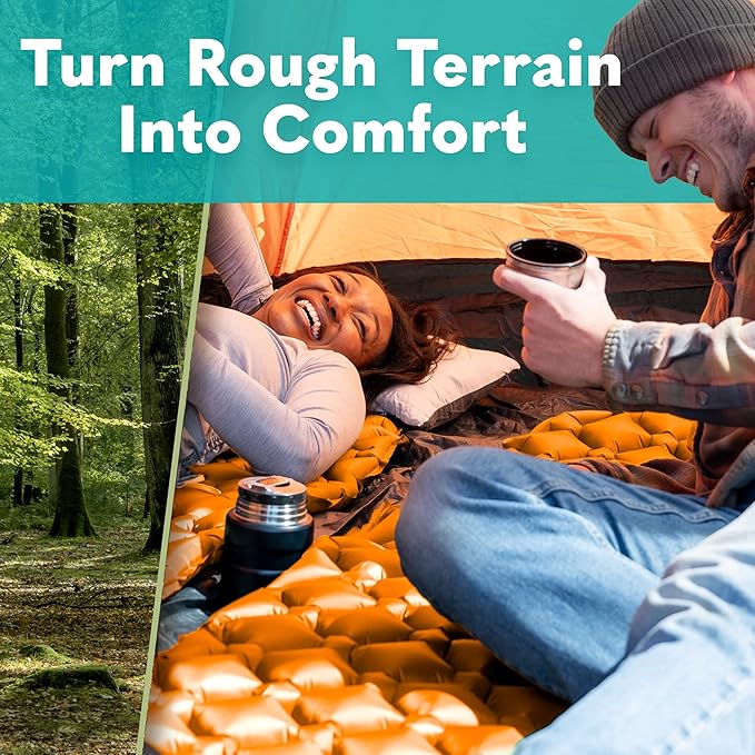 - COMFORT ON ROUGH TERRAIN - Sleepingo's sleeping pad backpacking ultralight innovative design and high-quality materials offer unbeatable comfort, even on rough and uneven terrain. The air mattress effectively cushions your body from rocks, roots, and bumps, providing a restful night's sleep amidst challenging outdoor conditions.