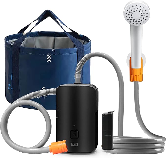 - 【Versatile Camping and Outdoor Use】 IPX6 waterproof, enough to handle short-time soaking and waterproof in daily use. Full battery life up to 80 minutes, to meet outdoor daily use of a family of 3-5 people. Intelligent design of two water flow stalls conversion button (Low stall 3L/Min; High stall 4L/Min) the perfect washing pressure. Portable Outdoor Camping Shower Applicable for outdoors, camping, pets cleaning, car washing, plants watering.