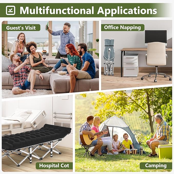 Slendor Folding Camping Cot Black, Sleeping Cot for Adults with Carry Bag, Mattress, 1200D Layer Oxford Portable Camp Bed Cot Bed for Guest Travel Office Beach