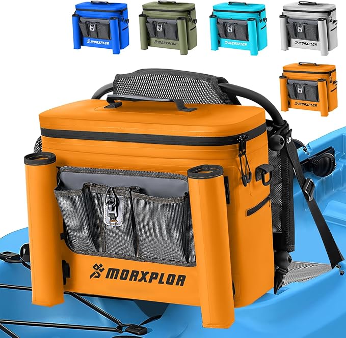 - 【Strong electroweld Structure】Morxplor Seat Back Kayak Cooler Waterproof Zipper and Waterproof Material Protect From Rain Splashes. Simply attach the bungee cord to securely attach seat cooler bag for kayak seat and fit all models of lawn chair seats. Removable storage pockets can hold keys, cell phones and fishing rods.