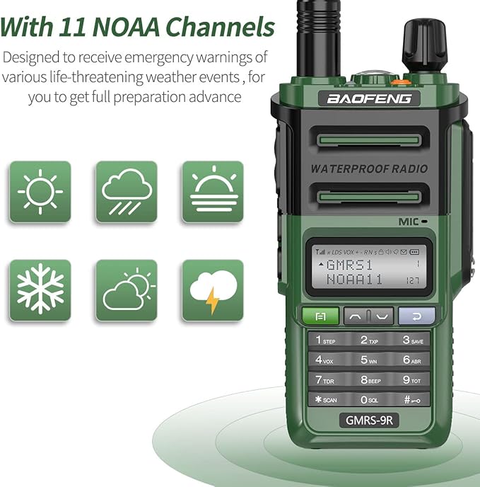 - Professional GMRS Radio:GMRS-9R has 30 GMRS channels + 11 NOAA weather channels,You can easily add new channels and change settings on the go by the PC and keypad menu programs, 155 Privacy Codes (50 CTCSS codes/ 104 DCS codes) ,Reduce interference. FFC ID: 2AJGM-P52UV.