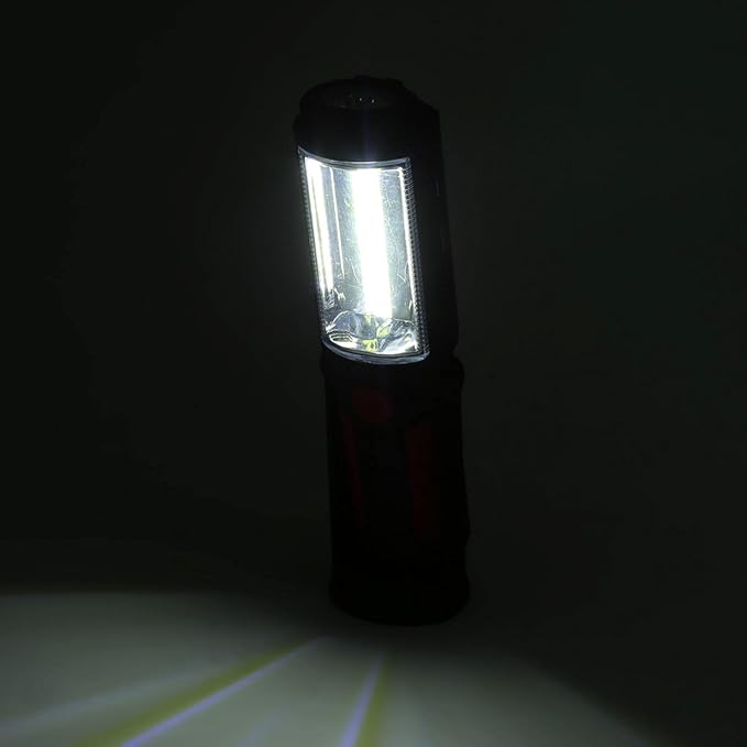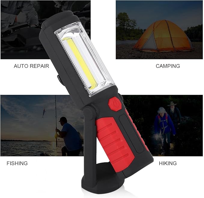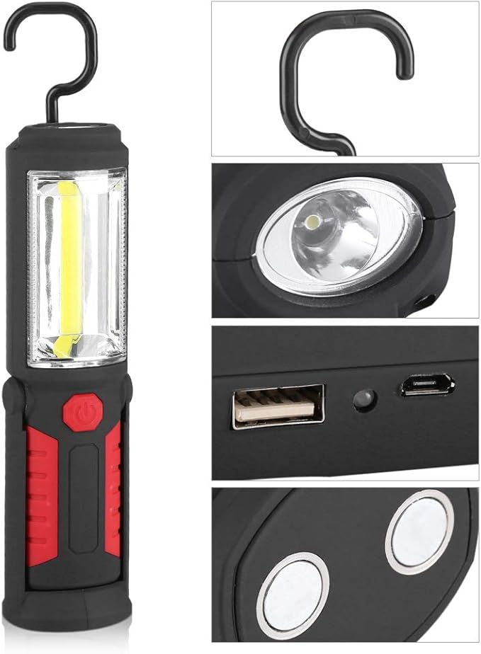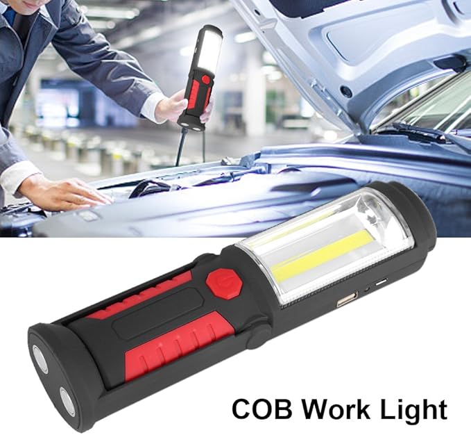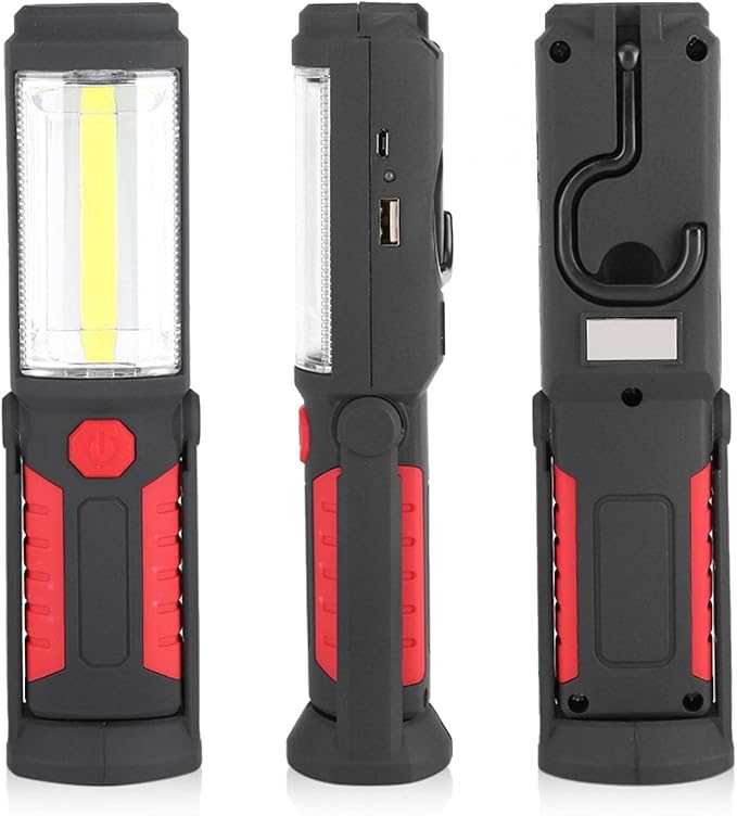- [Multiple Uses]: Our cob led rechargeable work light works great either as garage work light, workshop light, inspection lamp at job sites or as an outdoor lights portable for car repair, camping, reading, hiking, fishing or emergency; cob rechargeable portable work light adopts lightweight and foldable design for easily carry during hiking, exploring, walking the dog at night, fishing, etc