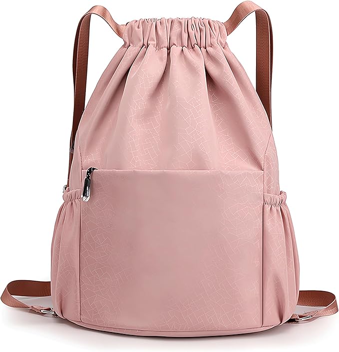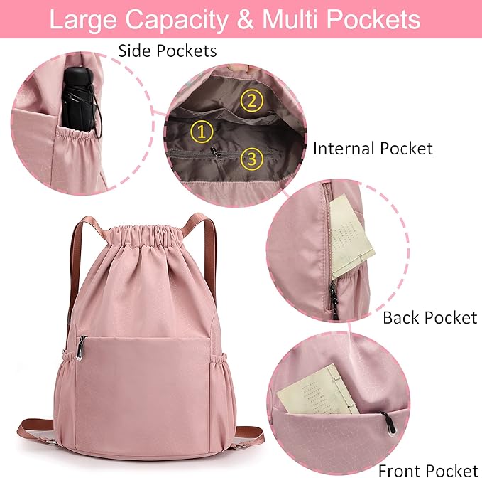 Drawstring Backpack Waterproof Small Gym Bag for Women String Backpack, Sports Gym Sack Cinch Bag with Multi Pockets (Pink)