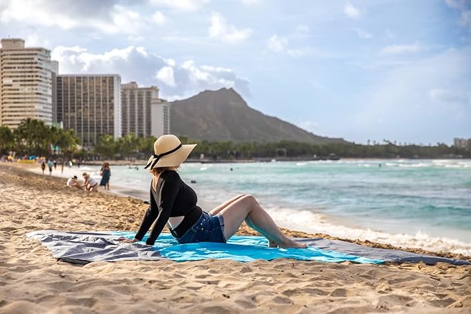 Sand Free Beach Blanket, Large Beach Mat, Water Resistant Mat Quick Drying, Lightweight & Durable with 4 Stakes & 4 Corner Pockets, Compact for Travel, Camping, and Hiking