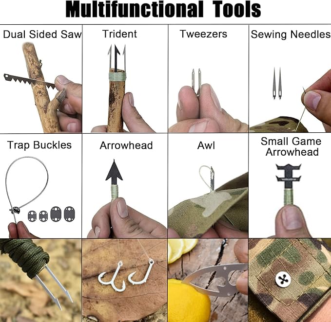 - Included Components : Knife, First Aid Kit, Fishing Tools, Fishing Line, Spoon, Credit Card Multitool, Hooks