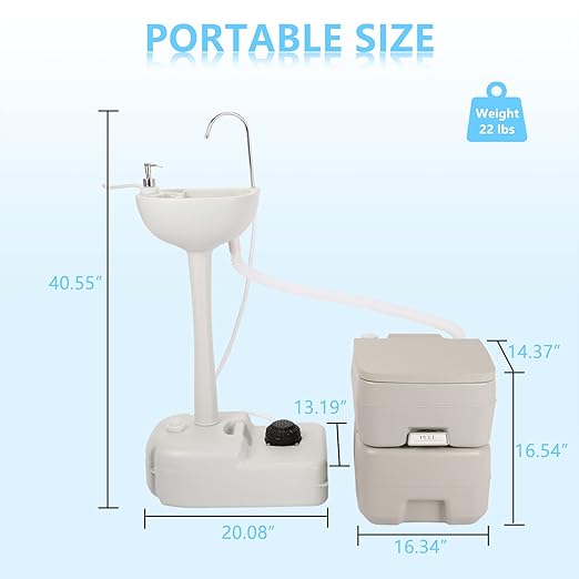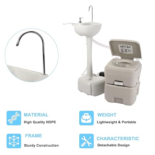 - 【 EASY TO CARRY & CONVENIENT】Detachable and lightweight design make the portable sink and toilet combo easy to store and transport in trunk of vehicle. The rolling wheels of the handwashing station and the carry handles of the composting toilet for easy movement