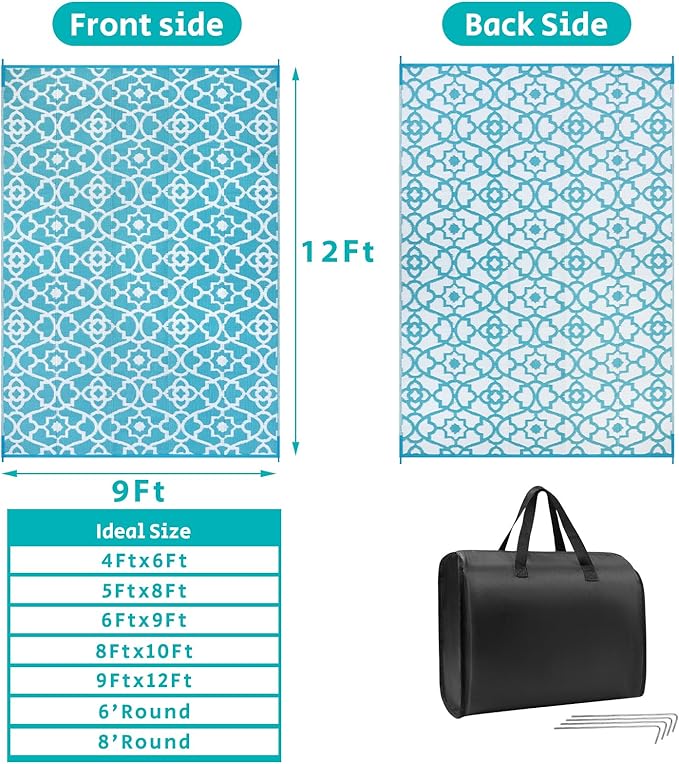 • Versatile Outdoor Carpet: The indoor outdoor plastic rugs have multiple choice in different colors(4'x6',5'x8',6'x9',8'x10',9'x12',9'x18',8'round), is ideal for a variety of indoor outdoor activities,like patio mat, deck rug, garden rug, beach mat, picnic mat, BBQ party mat, rv camping rug,pool rug,outdoor doormat,garage rug,front door mat,allowing you to have plenty of imaginable space for more fun.
