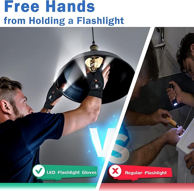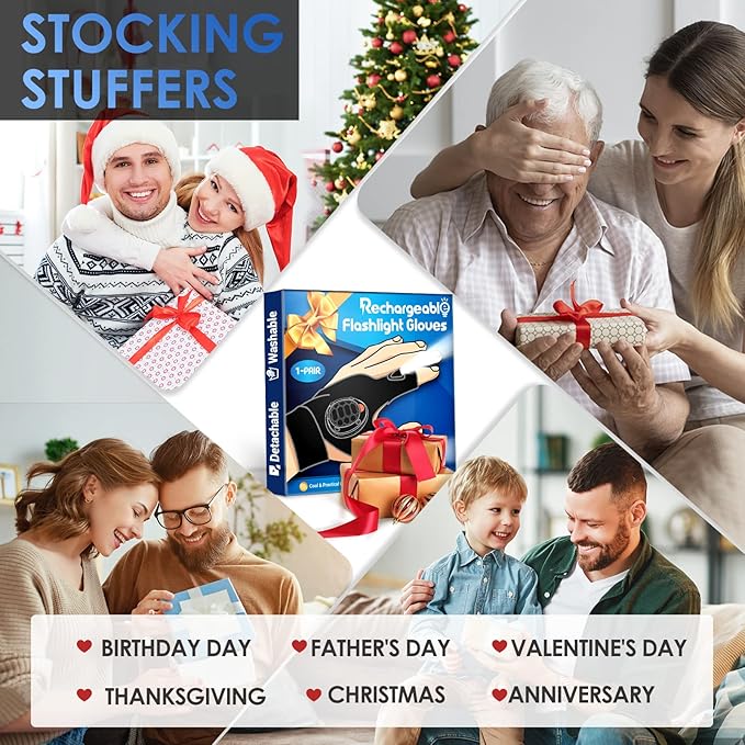 - Holiday Gifts Guide, Unique and Useful Gifts for Men/Women: Gift-wrap available rechargeable LED flashlight gloves are the right present for you! The lightweight gloves are ideal gifts for men, women, him, dad, father, husband, boyfriend, grandpa. The led flashlight gloves can be a wonderful gift on Christmas, stocking stuffers for men, anniversary, Valentine's or birthday for fishermen, handymen, plumbers, car lovers, electricians, engineers, night running and hiking lover, maintenance workers.