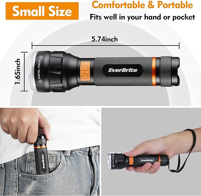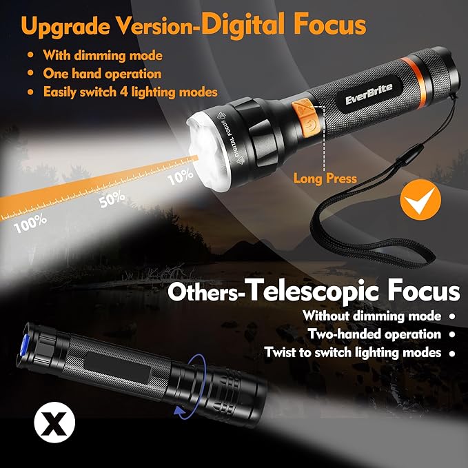 - Digital Focus Flashlight: The EverBrite flashlight uses digital focus to adjust light changes, one-hand operation, and can easily switch between spot, flood and strobe light modes, no need to operate with two hands like ordinary telescopic focus flashlight. Long press the button, you can also adjust the brightness of the light (0-100%), and at the same time realize the continuous alternating cycle of spotlight and floodlight
