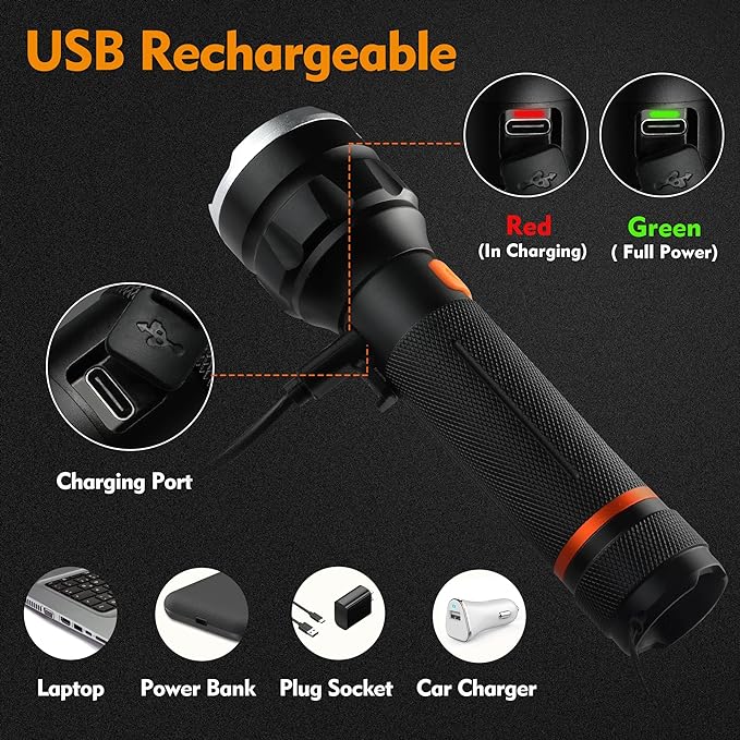 - USB Rechargeable Flashlight: The rechargeable flashlight comes with a rechargeable battery and type-c charging cable. You don’t need to worry about battery problems. Recharge in 3.5 hours with any 5V 1A USB output and the included micro USB cable. The flashlight is equipped with a charging indicator. It is a red light when charging. It is green when it is full