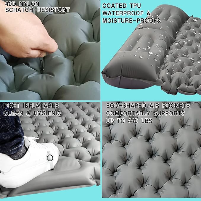 - 【Durable Material Different from Market】The back of the air mattress is made of 50D nylon polyester fiber + multi-layer TPU material, it won't tear even if you use a thick tree branch. The front side of the camping mattress is made of strong 50D nylon material + multi-layer waterproof and durable TPU material, which is strong, soft, noiseless and waterproof, even in the rain, you just need to wipe it with a towel. It can be used for many purposes, such as outdoor mat, camping mat, tent mat and so on.