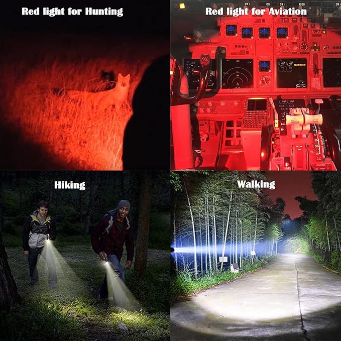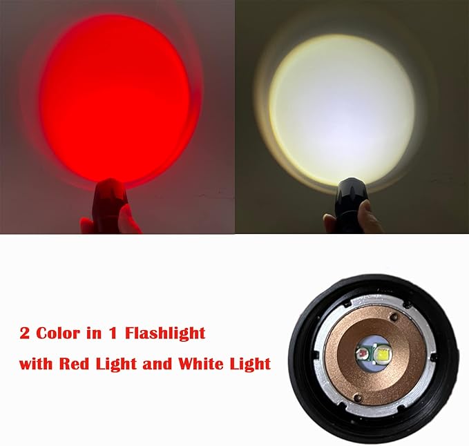 - DUAL COLOR: White and Red beams in one flashlight. Red light preserves night vision. White light for everyday work during the night and day