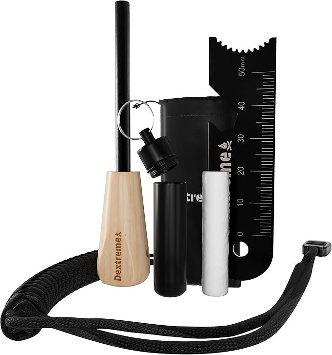 Dextreme Ferro Rod Flint Fire Starter Kit with Handcrafted Wood Handle, Coton Tinder, Transport Bag Multi-Tool Striker Paracord Lanyard for Camping Gear 12,000+ Strikes 5/16'' Thick Bushcraft Survival