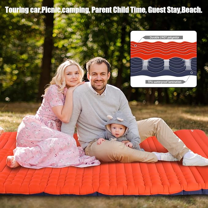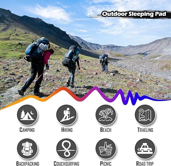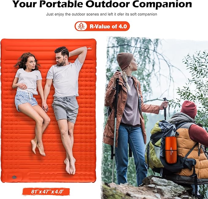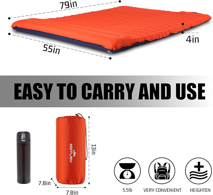 - 【DURABLE AND PORTABLE】: Extra-thick waterproof 40D nylon and TPU eco-friendly materials are durable and tear-resistant, making this compact sleeping pad ideal for harsh conditions in the wild. The thickened film ensures that our self-inflating camping pads are effectively puncture and moisture resistant without air leakage. Weighing only 5.5 lbs, this camping air mattress combines a 2-person sleeper and is ideal for family camping, hiking, backpacking, car travel or water recreation
