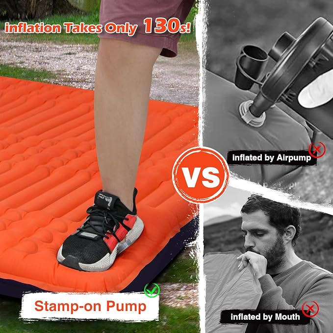 - 【Built-in foot pump】: No mouthpiece, no extra pump, the Megior wide sleeping pad comes with a built-in foot pump. This thick, large sleeping pad takes just 2 minutes to fully inflate, no mouth, no hands, and it's hygienic enough that even a child can do it. Two double-layer valves on the pillow effectively prevent air leaks and allow for quick deflation, just remember to close the valve before inflating. NOTE: Inflation time depends on how fast you pedal.