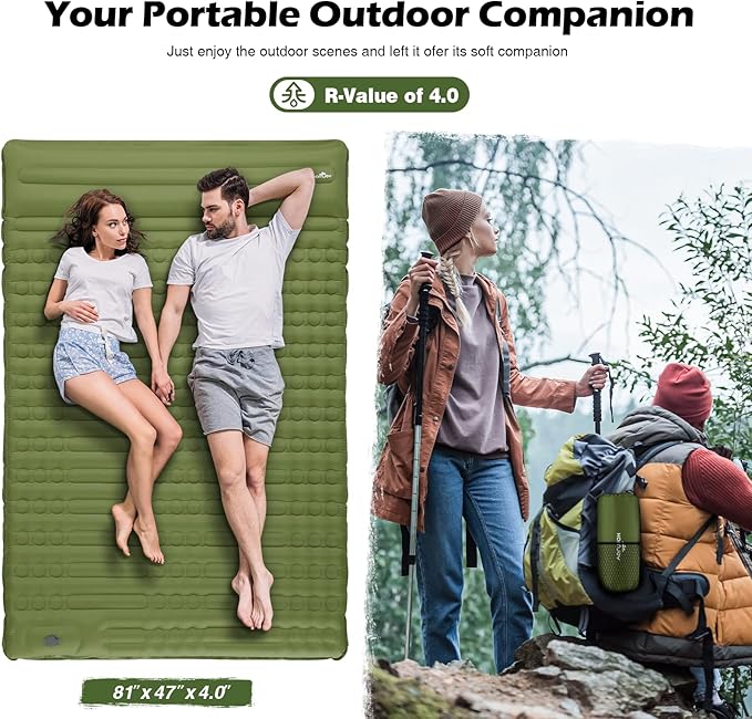 - 【4" THICK Extra Thick & Wide Camping Pad】:Megior latest sleeping pad is wider and thicker than others on the market. Inflatable pads can be up to 4 inches thick once full of air, which is our biggest advantage.After inflated,it can stay away from the hard ground,won't touch the ground no matter how you flip and you can sleep comfortably in any sleeping position,gives you a comfortable sleeping environment.