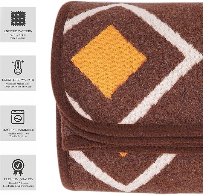 PuTian Merino Wool Blanket - Warm Thick Washable 87" x 63" Large Throw for Outdoors Camping Couch Bed Trave, Brown Check