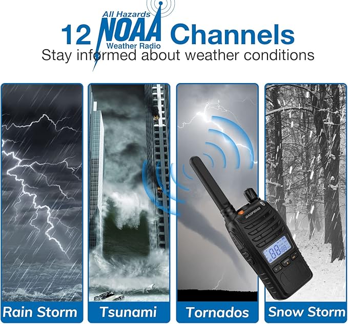 - NOAA Weather Scan & Alert: NOAA weather scan will automatically scan through 12 available weather band channels of the walkie talkies, then locks onto the strongest weather channel to alert you to extreme weather.
