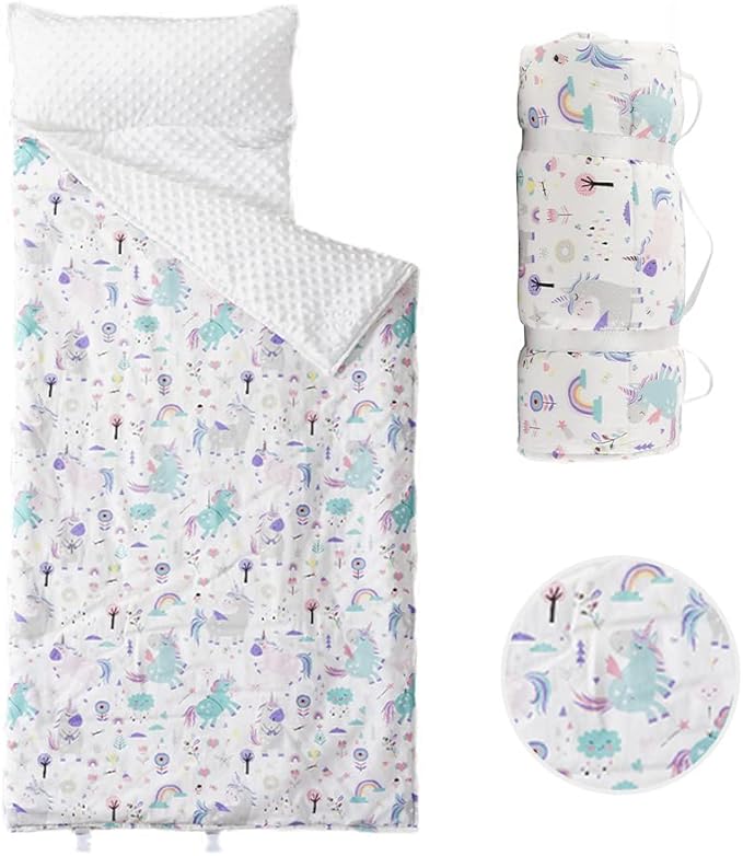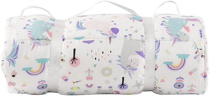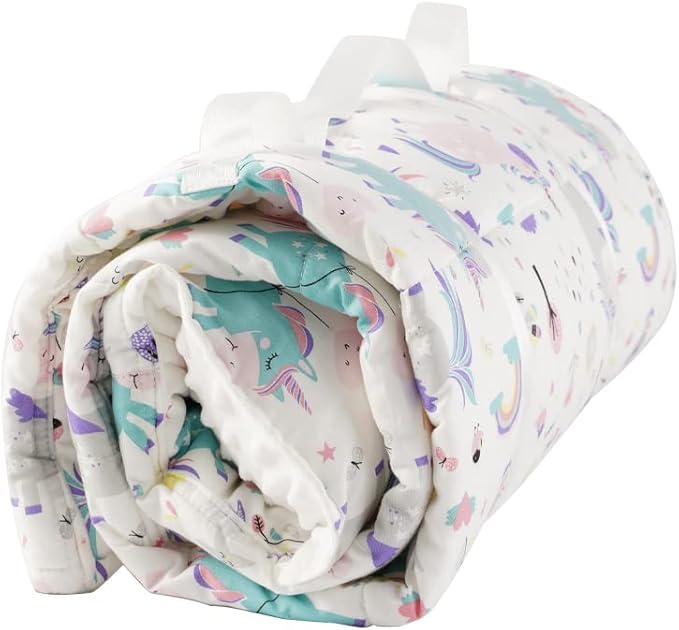 - CONVENIENT FEATURES: Designed to roll-up, velcro close, and carry away with a handle, this nap blanket with pillow is easy to carry to daycare, school, on playdates, or on trips. Our padded nap mat is a toddler and baby essential.