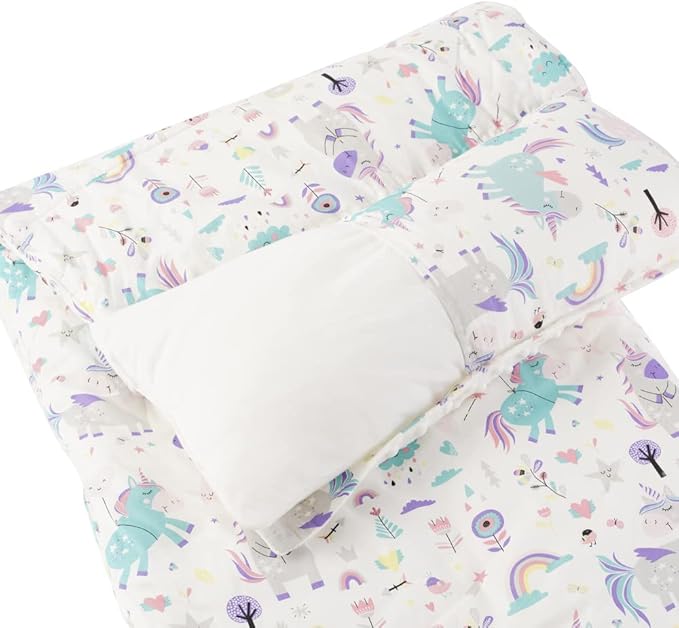 - COMFORTABLE AND WARM: Each lightweight toddler sleeping bag consists of a built-in floor mat, a warm attached blanket, and a pillow - all comprised of a soft cotton and polyester blend that is sure to be gentle on your little one’s sensitive skin.