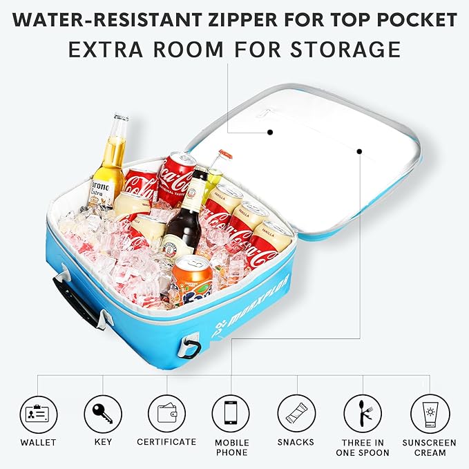 - Paddleboard Cooler Mesh Top Pocket Easy &Reliable to Use:The zipped mesh top keep your items handy and organized.The included hooks allow easy installation to D-rings and bungees.The side handle makes carry the waterproof sup cooler and deck bag like a breeze.