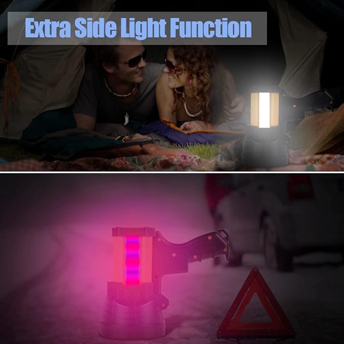 - Superbright Handheld Spotlight: The main light has 3 brightness modes: 1. High light/2. Low light/3.Long press 3 second switch to strobe light. The side light also has 3 brightness light modes: 1. High light/2. Low light/3.Long press 3 second switch to red and blue warning lights.