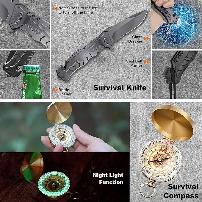 - 【15 in1 Professional Survival Kit】The survival kit contains 15 must have survival gear and equipment: tactical pen, flint stone & scraper, wire saw, flashlight, multifunctional card, bottle hanging buckle, compass, survival bracelet, climbing hook, dual-tube whistle, emergency blanket, waterproof box.