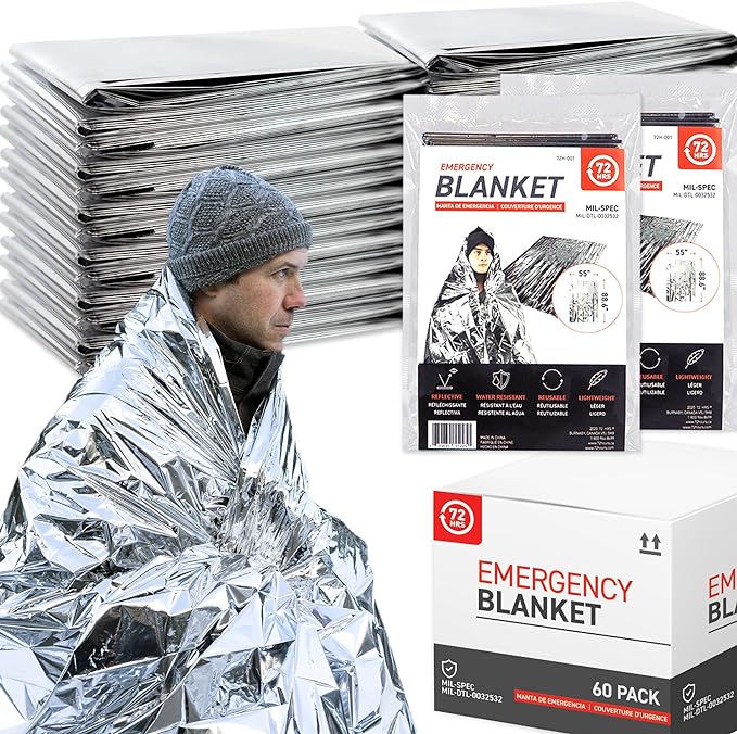 72 HRS Extra Large MIL-SPEC Emergency Mylar Thermal Blanket (Pack of 60) Heat Space Survival Blankets for Car, First Aid Kit, Hiking, and Shelter