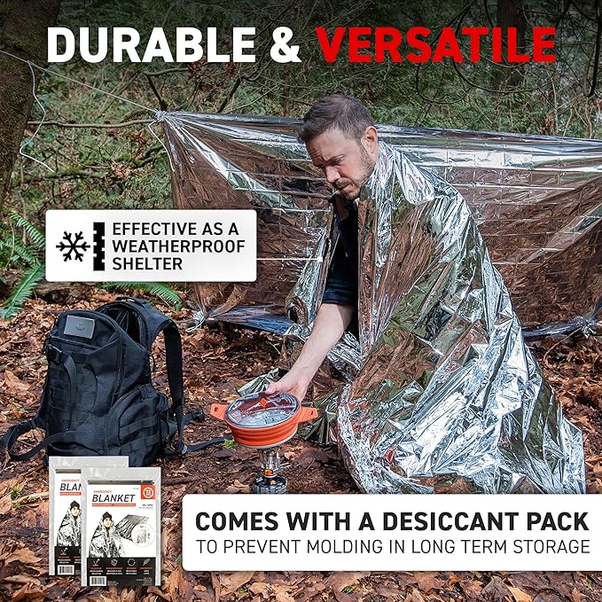 - ✅【ESSENTIAL】Survival heat blankets are necessary for any outdoor venture. Throw it in your pack and keep one in your car for ensured peace of mind. In cases of emergencies, this multifunctional, insulating, weatherproof solar foil blanket not only provides considerable heat in extreme cold situations, but can also be used to build shelter protecting you and your family from the elements.