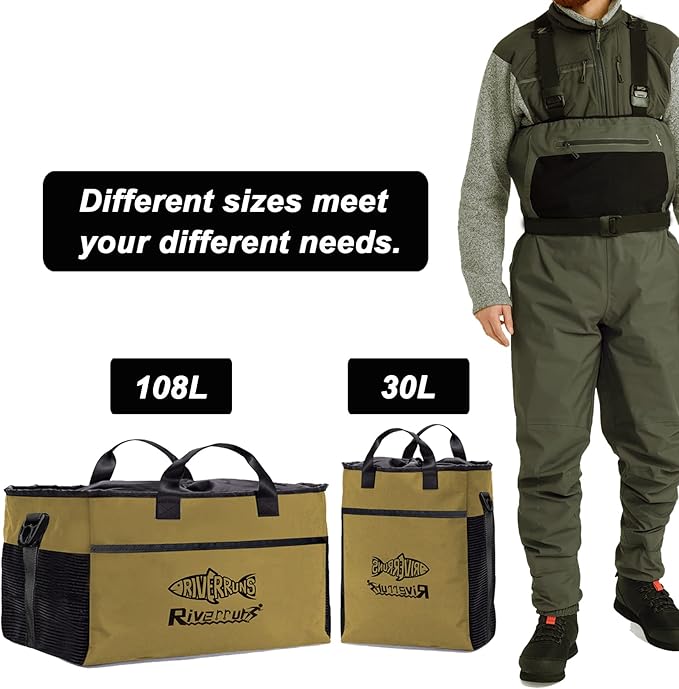 - 【Dimension】The fishing gear bag comes in different size: the medium bag is 16 x 12.5 x 9 inches, the large bag is 16 x 13 x 13 inches, and the extra-large bag is 23 x 20 x 14 inches. The capacity is 30 L,60L and 108 L respectively. The shoulder straps are adjustable so you can adjust it to your liking, and also can use it as shoulder bag, hand bag, crossbody bag. It's perfect for storing waders, boots, rain gear or extra dry clothes.