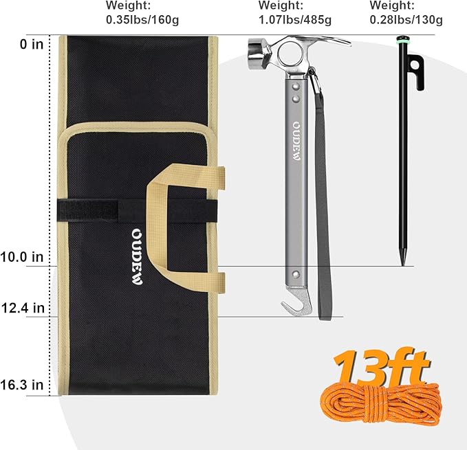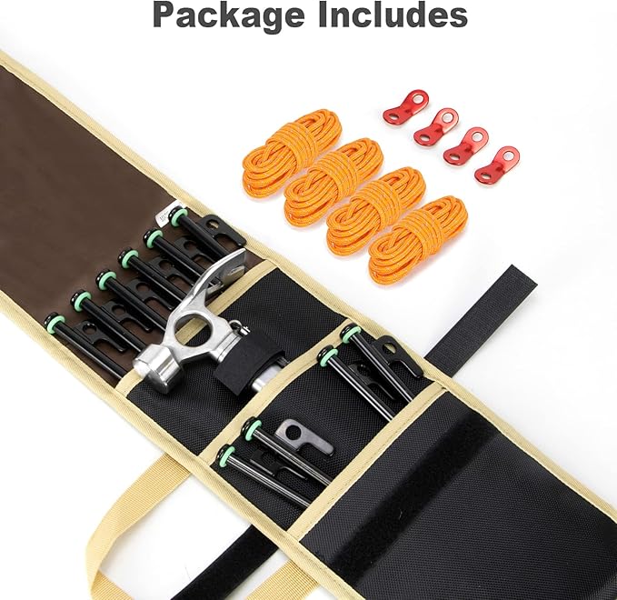 - CAMPING ACCESSORIES KIT INCLUDE: 1 camping hammer, 10 camping stakes, 4 reflective tent ropes with aluminum adjuster and 1 storage bag
