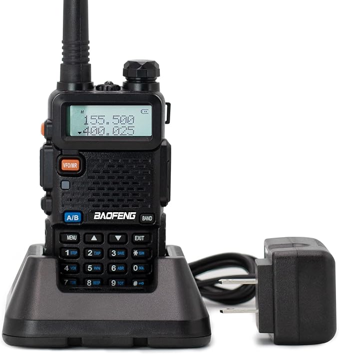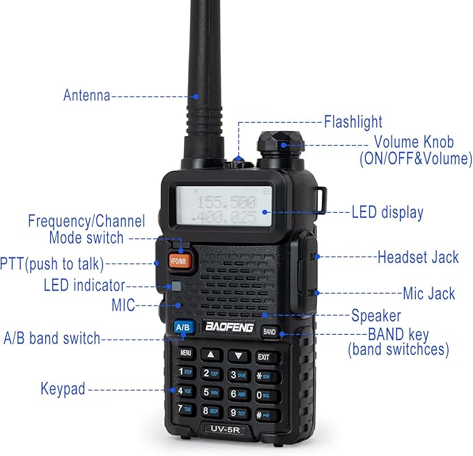 - ① BAOFENG UV5R radio: This ham radio handheld has been tested by an FCC accreditted lab and complies with the limits for a Class B digital device, pursuant to part 15B and part 97 of the FCC Rules. FCC ID: 2AJGM-UV5R, Transmit frequency range: VHF 144-148MHz and UHF 420-450MHz; Receive frequency range: VHF 136-174 MHz and UHF 400-480 MHz.